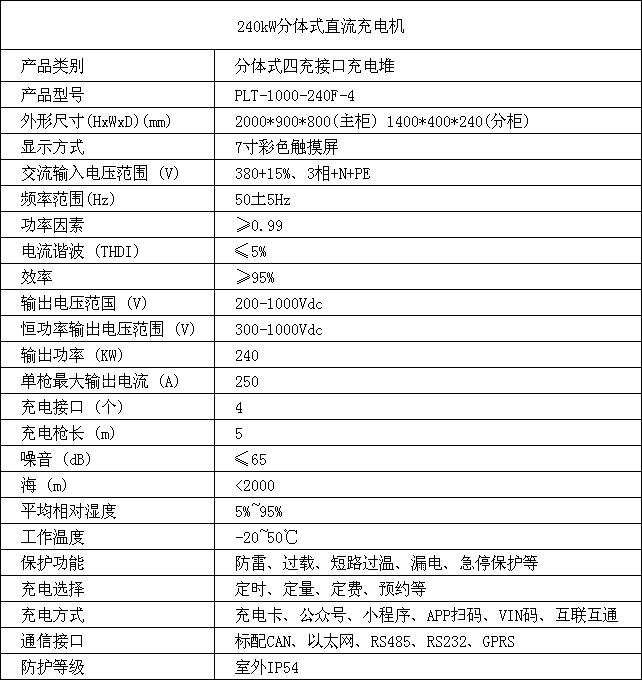 分体式直流充电桩适用于在电动汽车充电站为电动汽车进行直流快速充电,采用分体式设计,充电机独立承载和安装,单独散热,环境适应性好。系统由模块化直流充电柜和直流充电桩两部分组成,主要由主控模块、电源模块、触摸屏、读卡器、LED指示、电能表、充电枪、急停按钮等部分组成。